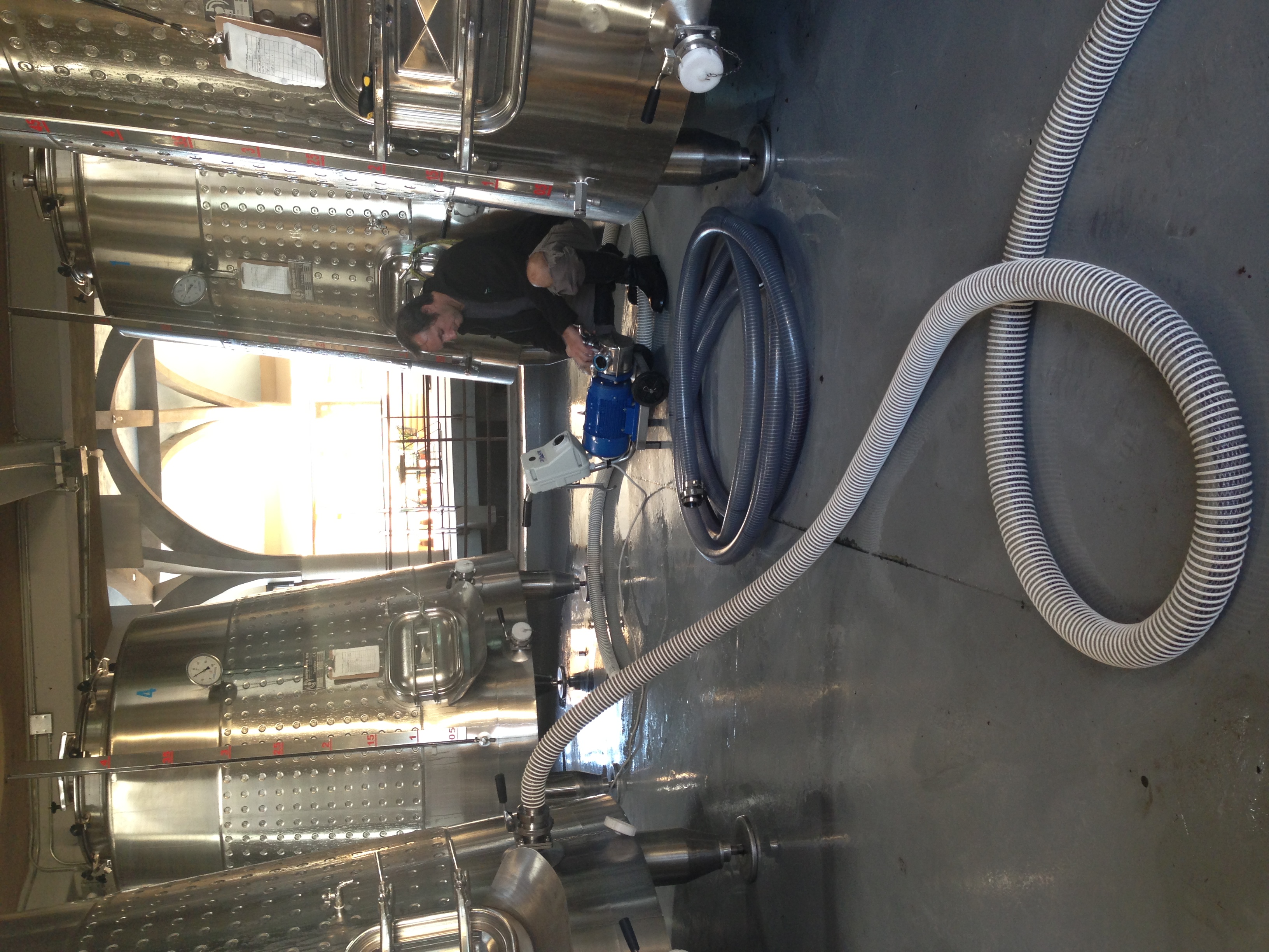 Como ya observamos y platicamos, la uva pasa del viñedo por el proceso de selección y despalillado en el piso superior y cae (por gravedad) dentro de los tanques de fermentación.